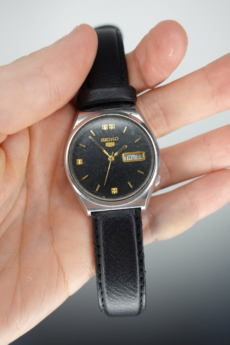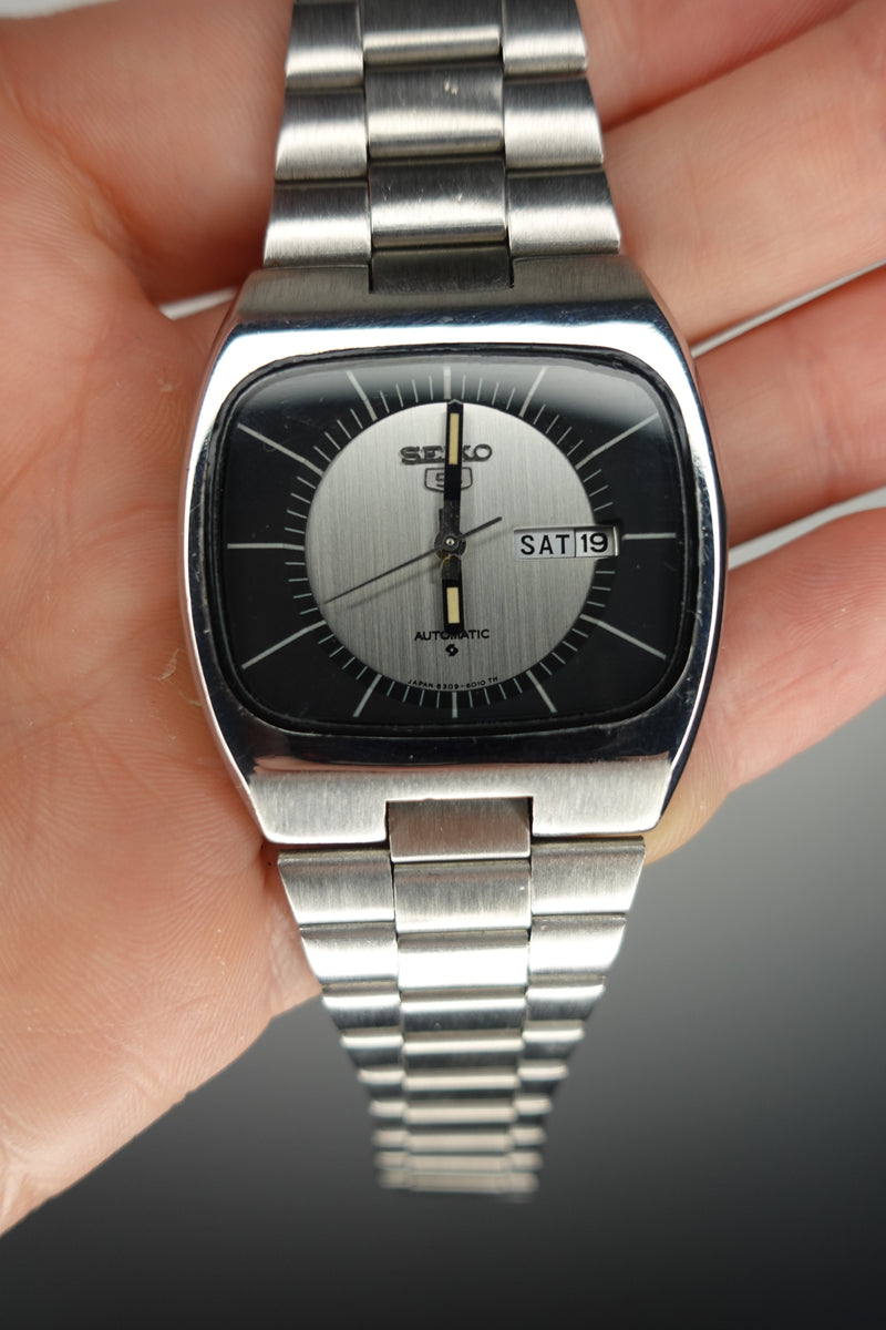 Seiko 5 Automatic 17 Jewel Day Date Black & Silver TV Dial 6309-6010 - Vintage