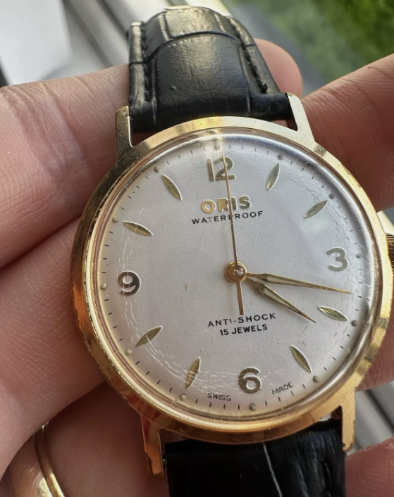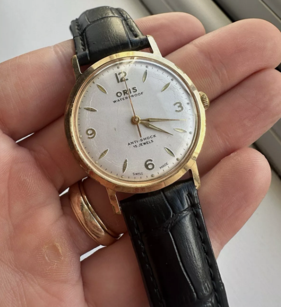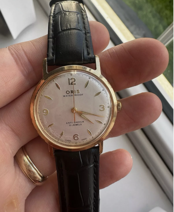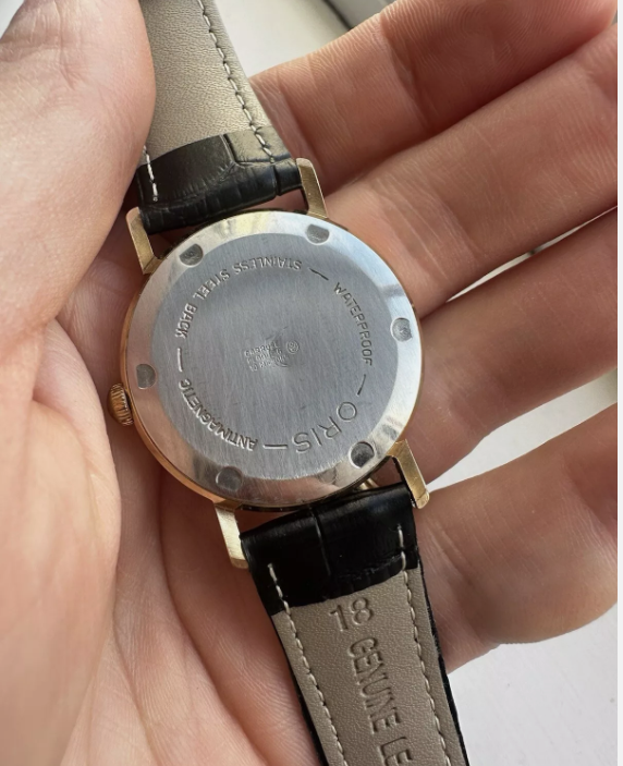 Beautiful vintage Oris hand wind watch with a new black leather strap fitted. The crystal is showing some sign of its age with imperfections and there is a dent on the caseback.