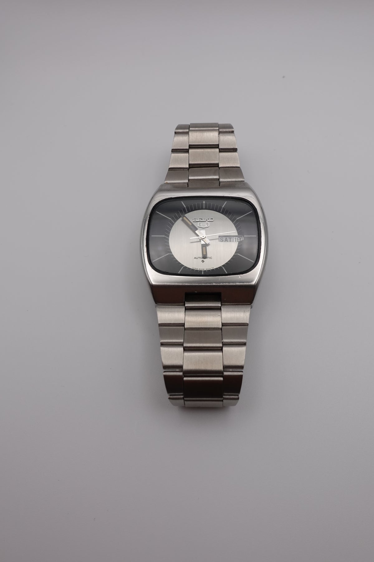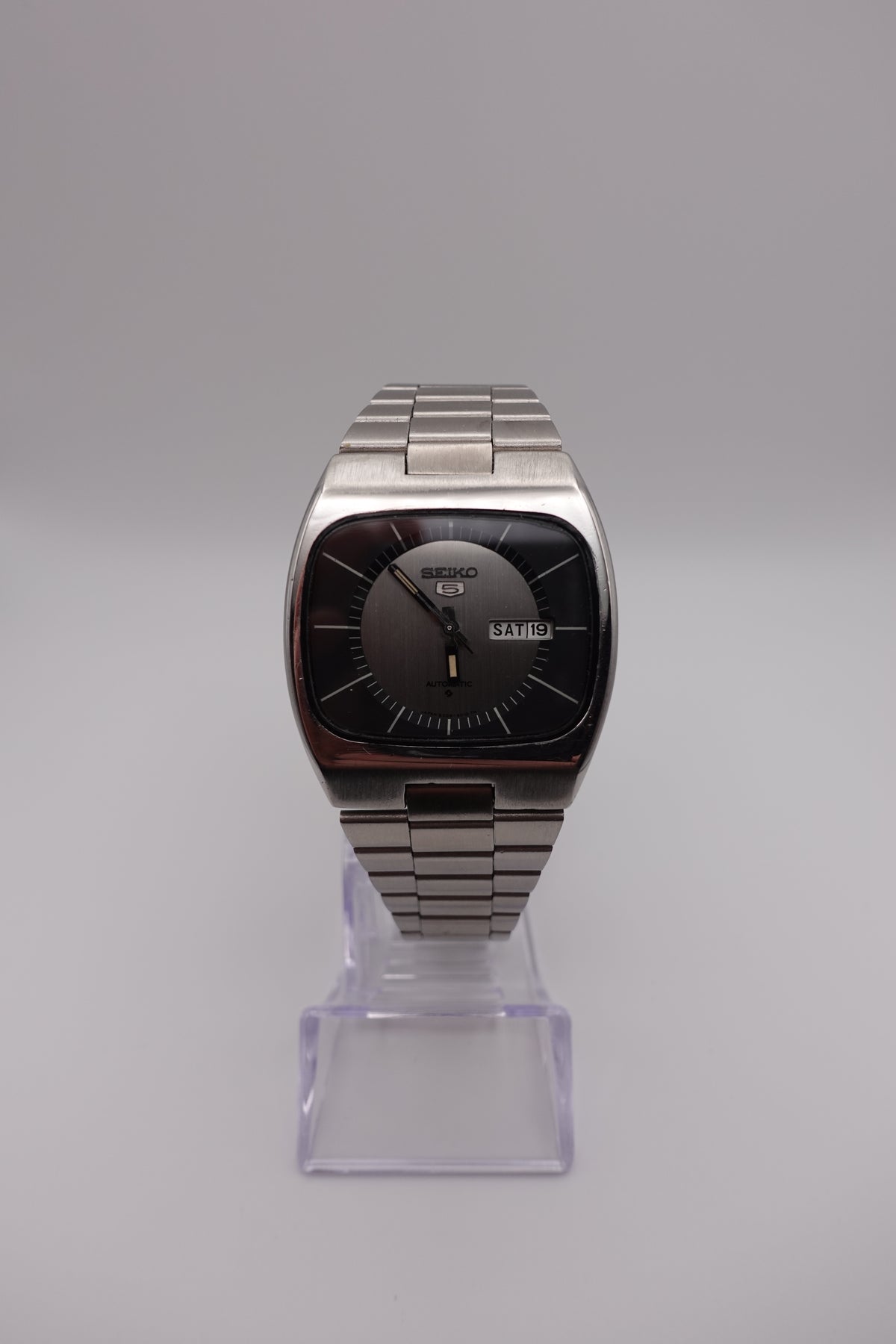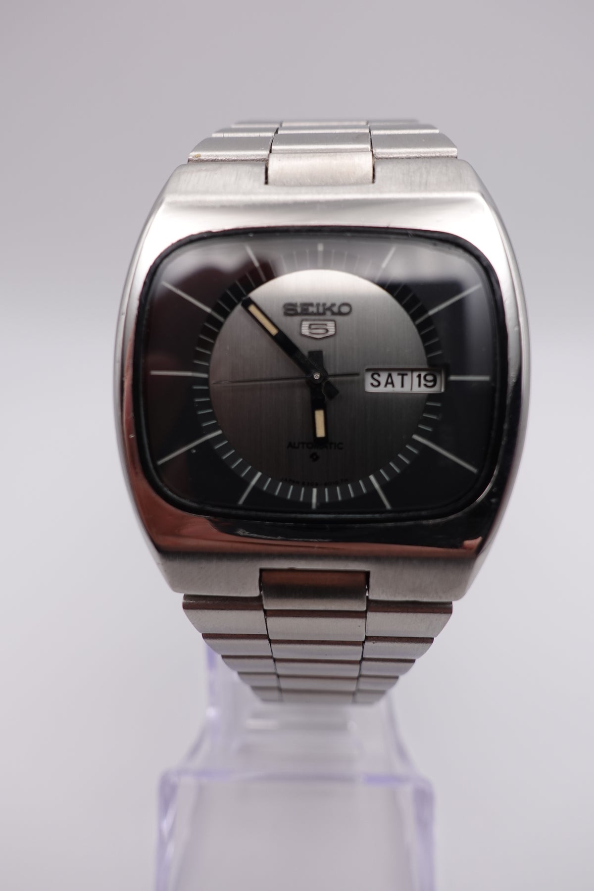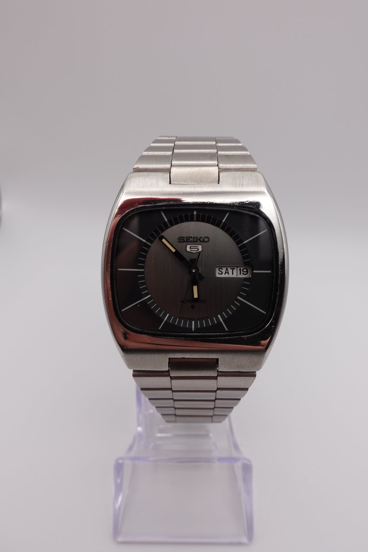 Stunning vintage Seiko 5 automatic with a tv dial. The watch is in fantastic condition and showing very little signs of wear or of age. It has a beautiful sunken dial in a striking silver and black. The clasp is unfortunately not original, though the bracelet still appears to be original.