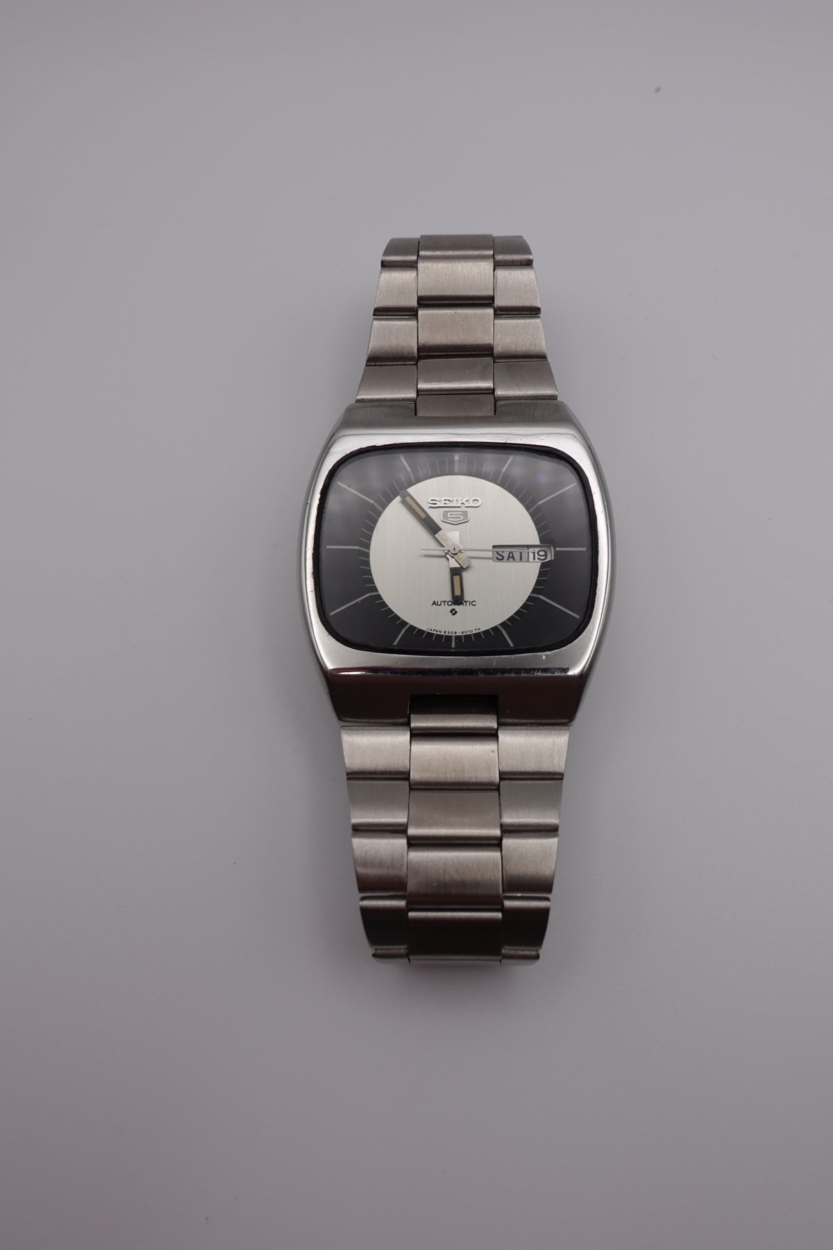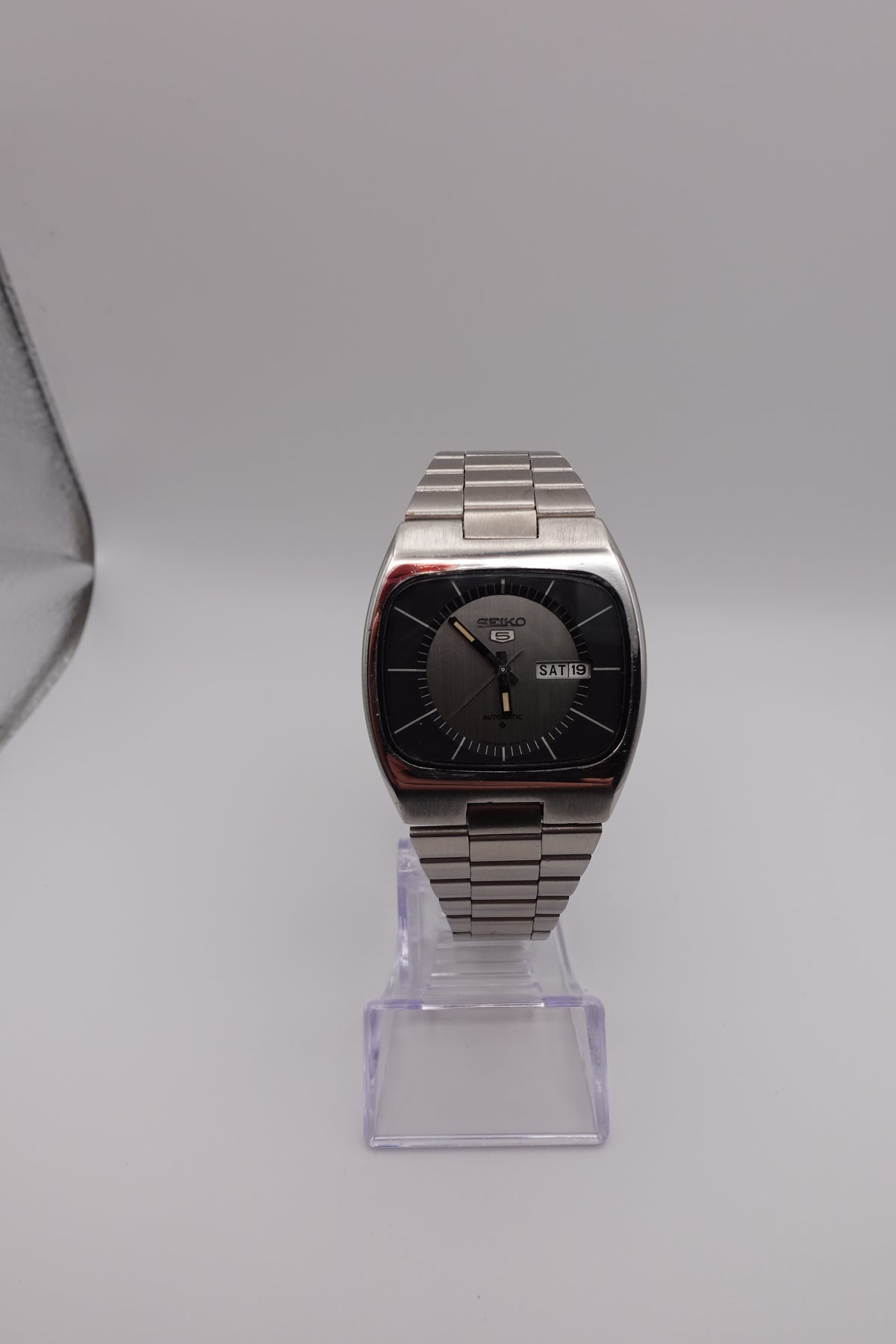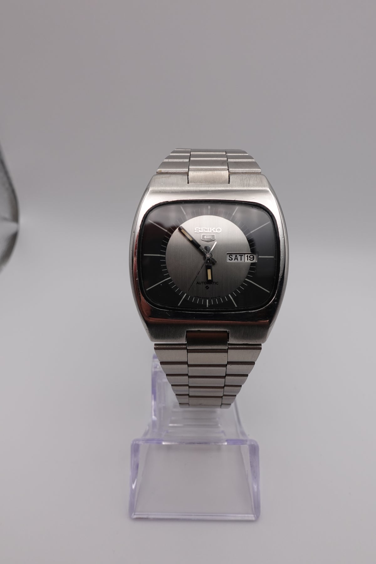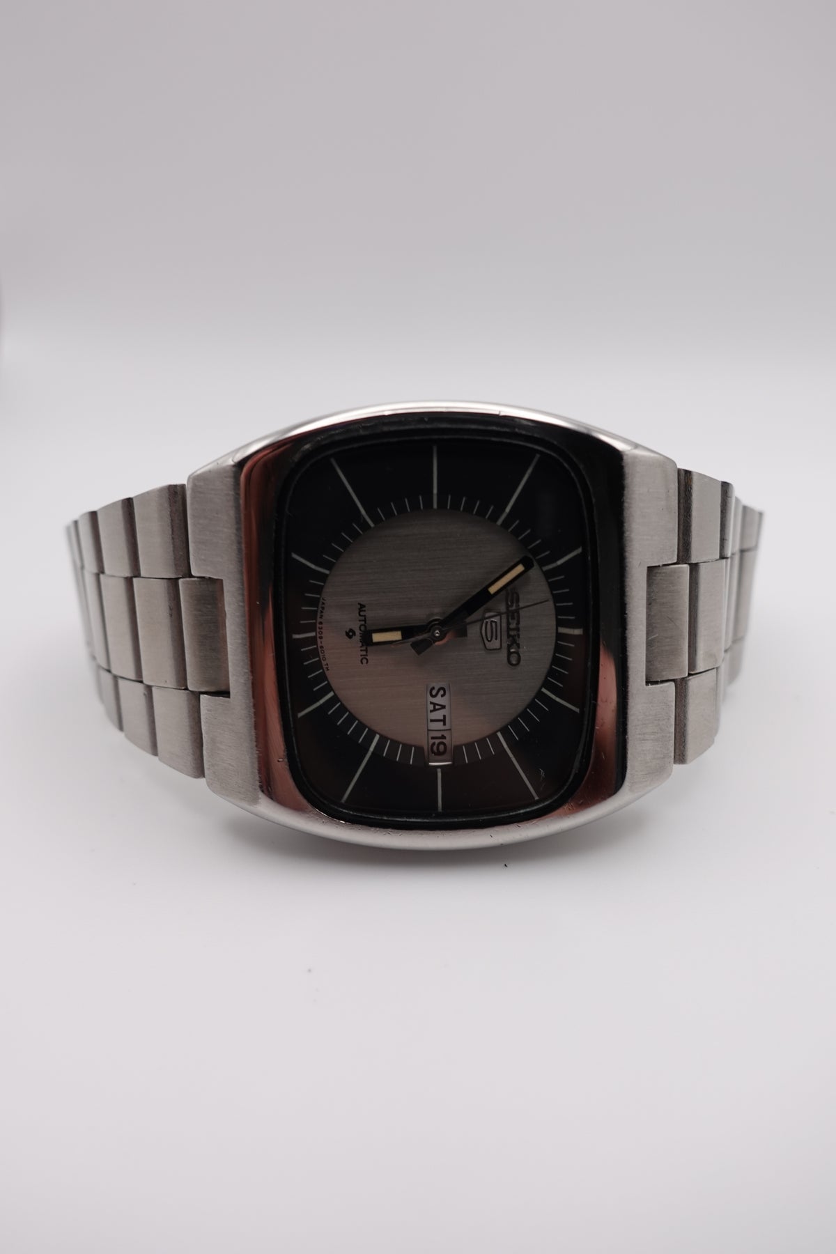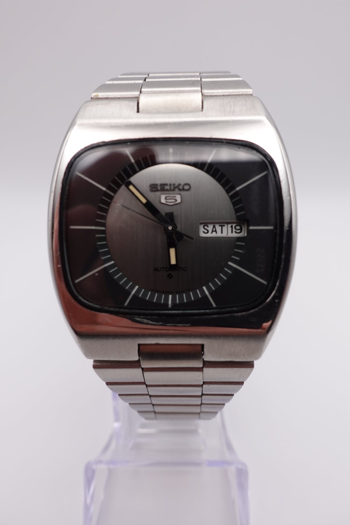 Stunning vintage Seiko 5 automatic with a tv dial. The watch is in fantastic condition and showing very little signs of wear or of age. It has a beautiful sunken dial in a striking silver and black. The clasp is unfortunately not original, though the bracelet still appears to be original.
