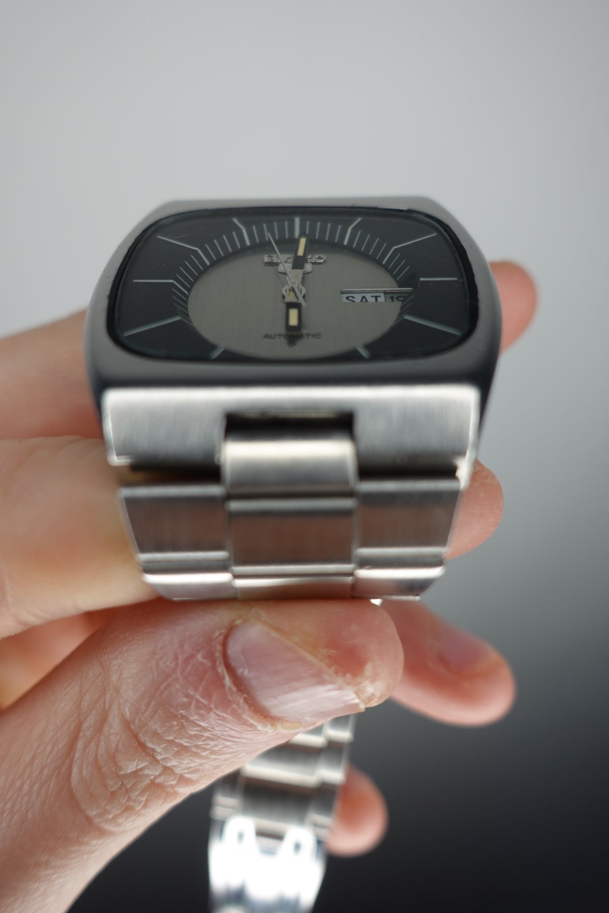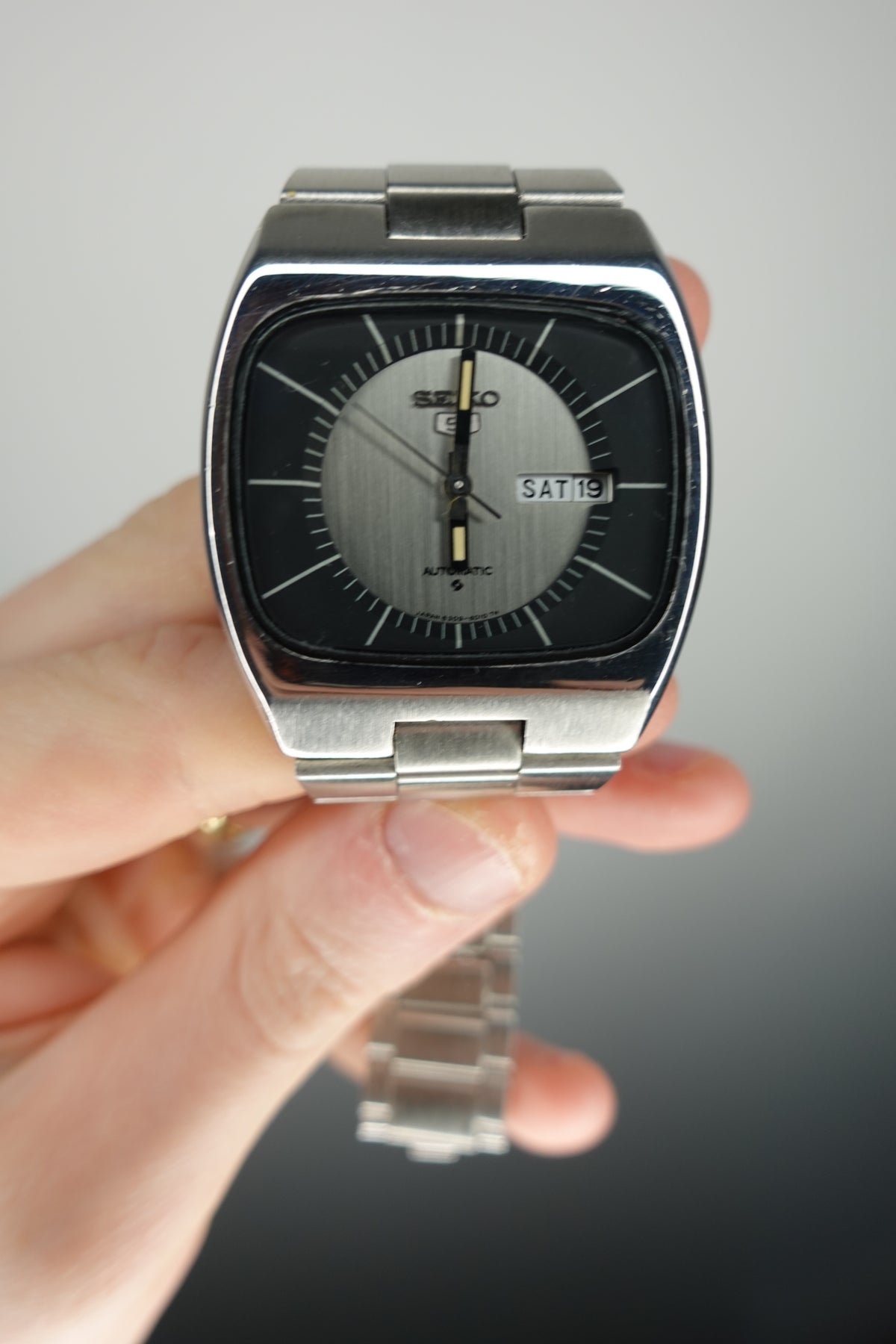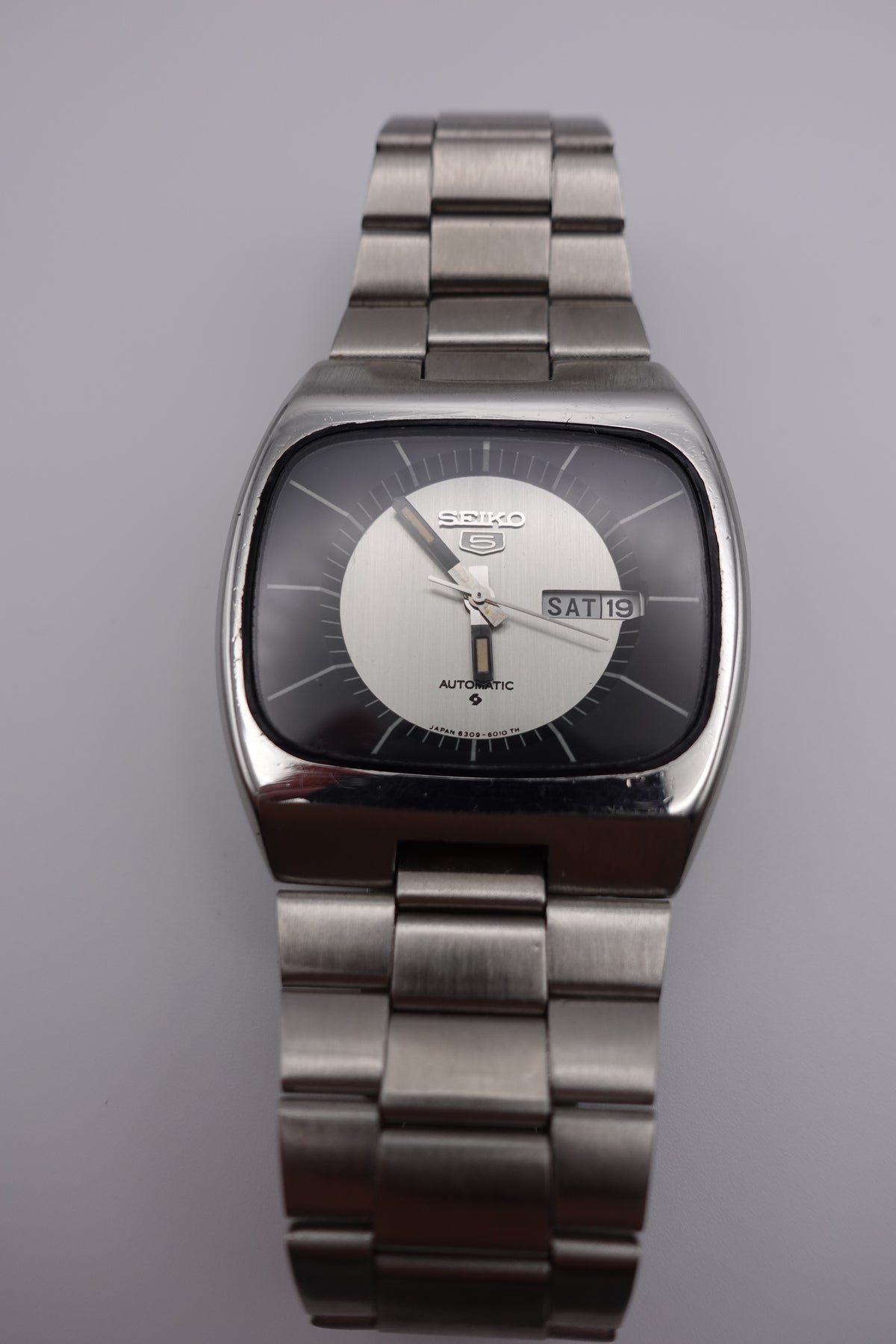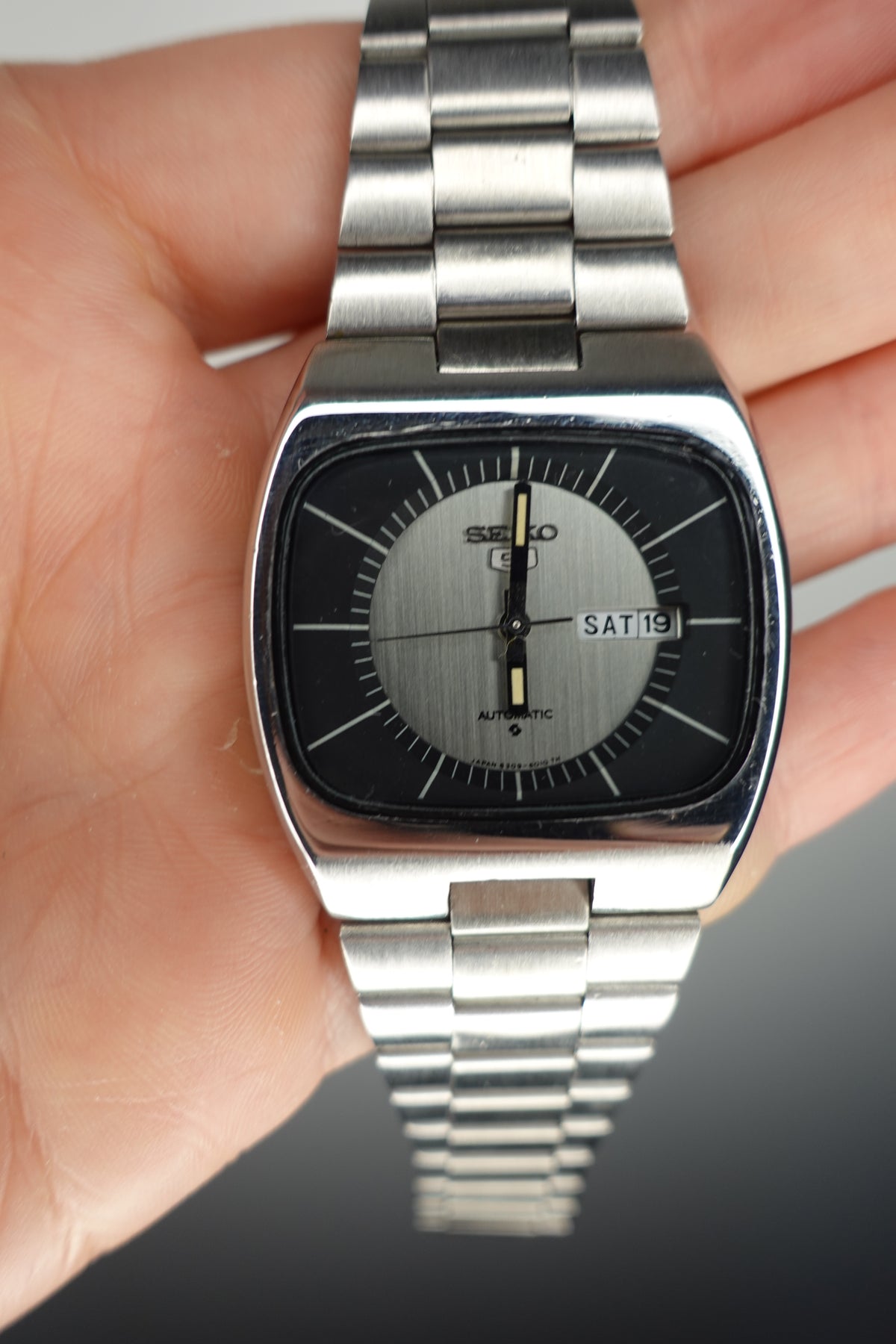 Stunning vintage Seiko 5 automatic with a tv dial. The watch is in fantastic condition and showing very little signs of wear or of age. It has a beautiful sunken dial in a striking silver and black. The clasp is unfortunately not original, though the bracelet still appears to be original.
