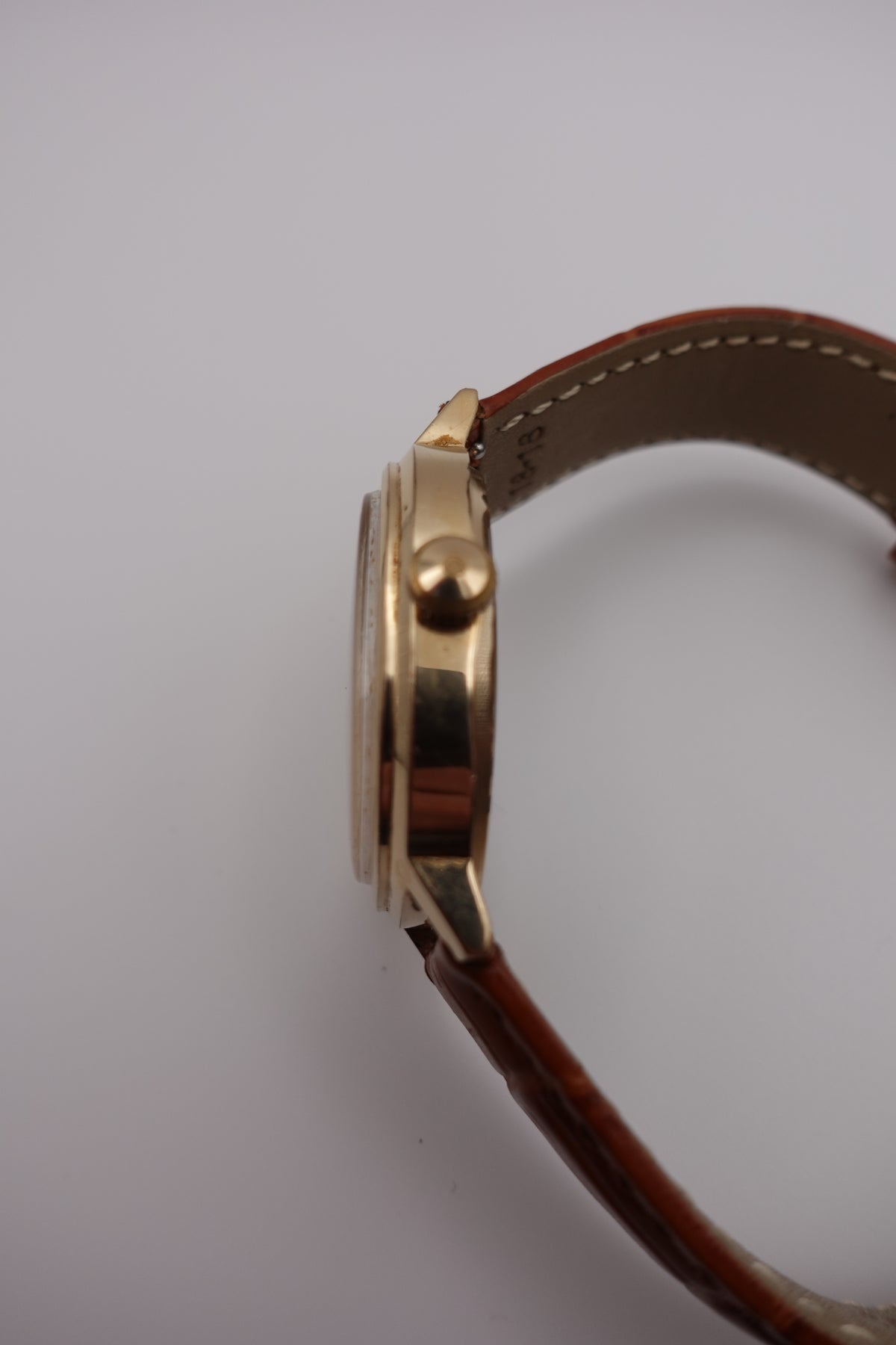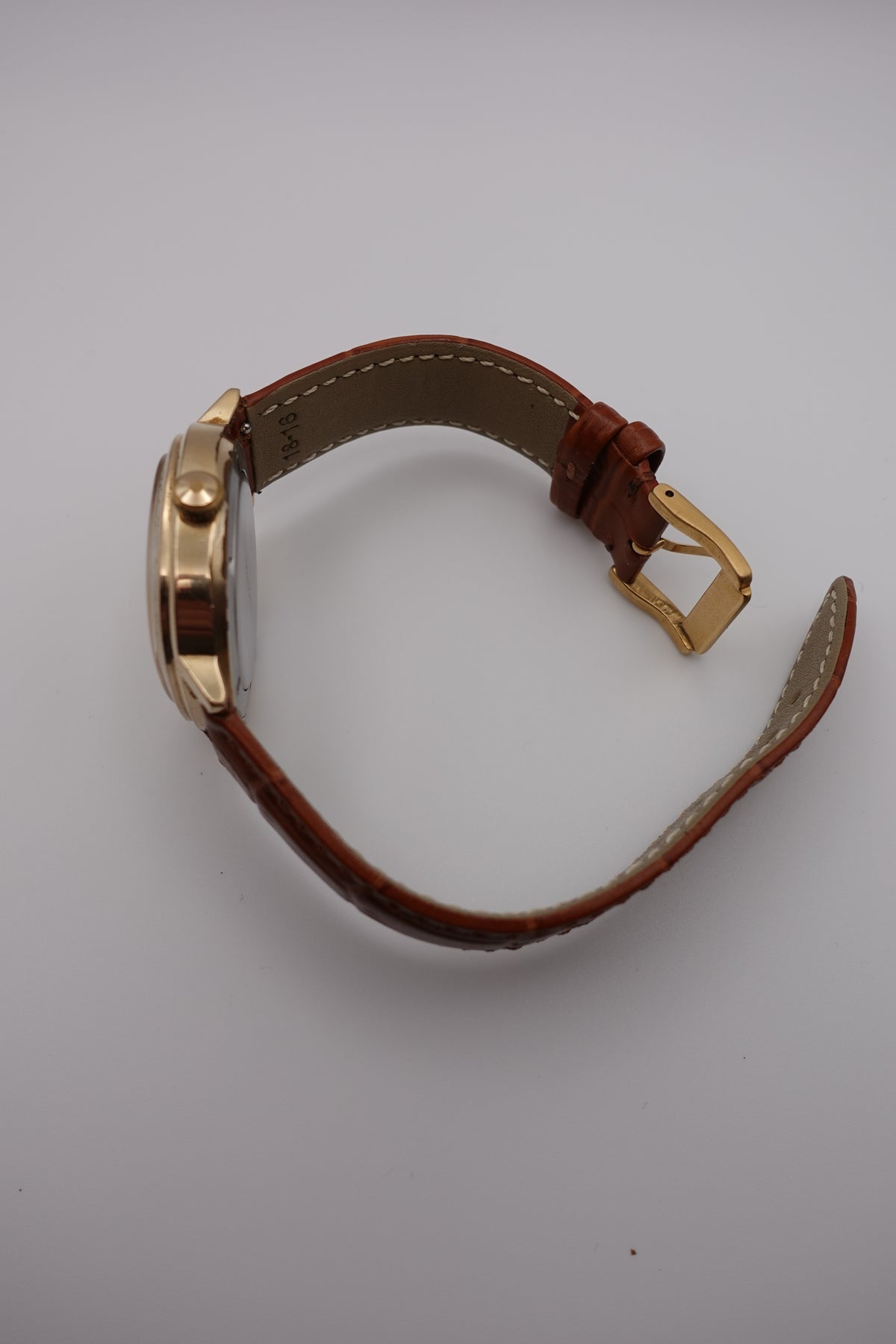 The watch crystal has some light scratches and the rear of the case has some minor chipping. A new brown leather bracelet has been fitted.