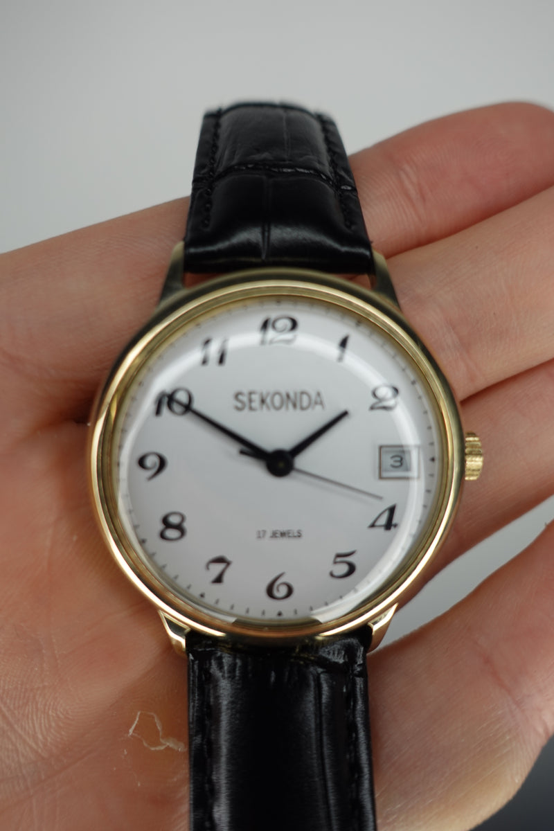 Sekonda Hand Wind 17 Jewel Date White Dial Gold USSR Made 299827 - Vintage